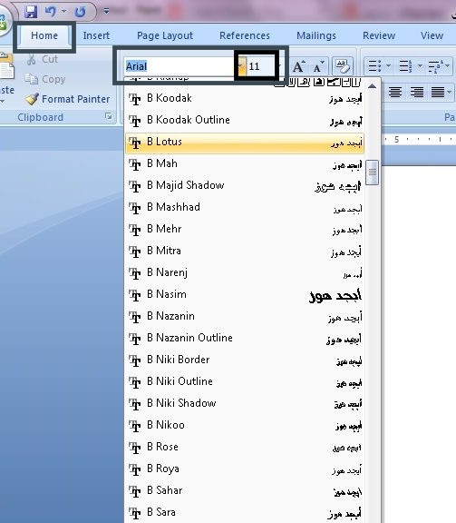 برای انجام این تنظیمات روی منوی Home رفته و مطابق شکل، فونت و سایز مورد نظر را انتخاب نمایید.