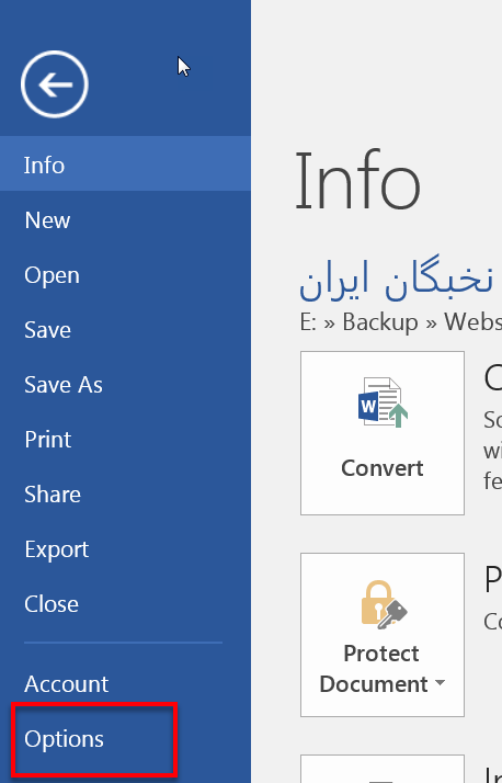 سپس گزینه options در انتهای حاشیه پنجره ای که باز می شود