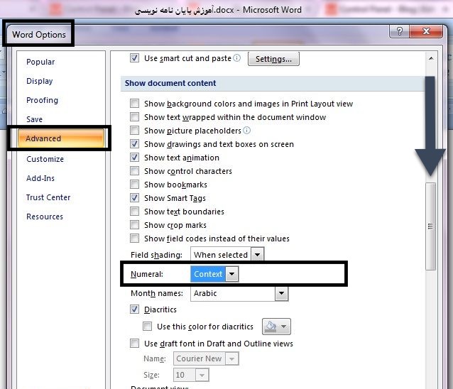 روی گزینه Advanced کلیک کنید و در پنجره ای که ظاهر می شود رو به پایین اسکرول کنید تا مطابق شکل زیر در قسمت Show document content، گزینه Numeral را مشاهده نمایید.