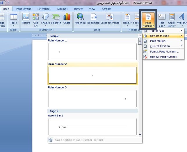 برای این کار، از منوی Insert، بر روی گزینه Page Number کلیک کنید. با بردن موس بر روی گزینه Bottom of Page، پنجره دیگری باز می شود.