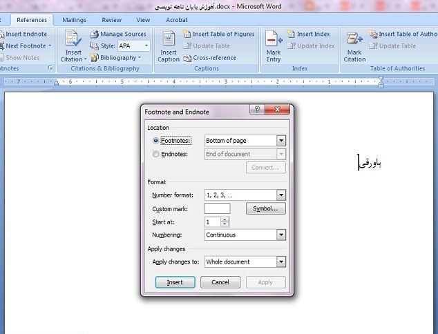 بعد از اینکه یکبار مطابق روش بالا پاورقی را وارد کردید و تنظیمات مورد نظر را در پنجره Footnote and Endnote اعمال کردید، برای سادگی و سرعت در نوشتن پاورقی می توانید به روش زیر عمل کنید.