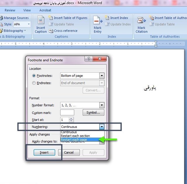 مثلث جلوی Numbering را کلیک کرده و گزینه Restart each page را انتخاب نمایید تا پاورقی ها در هر صفحه، مجددا از شماره ۱ شروع شوند.