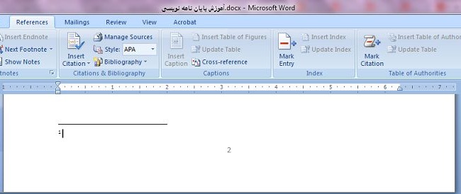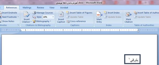 در انتهای کلمه مورد نظر می توانید از کلیدهای Ctrl+Alt+F استفاده کنید. شماره پاورقی در انتهای کلمه ظاهر شده و مکان نما به انتهای صفحه می رود (مطابق شکل بالا).