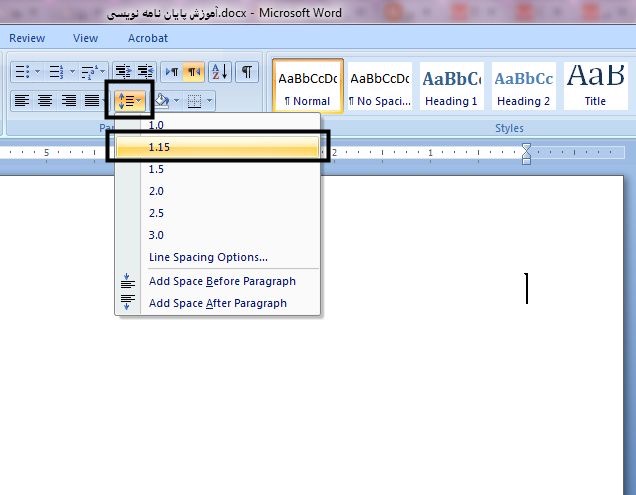 برای این کار، در منوی Home، روی علامت Line spacing کلیک کرده و فاصله مورد نظر بین خطوط را که معمولا ۱٫۱۵ یا ۱٫۵ می باشد، انتخاب نمایید.