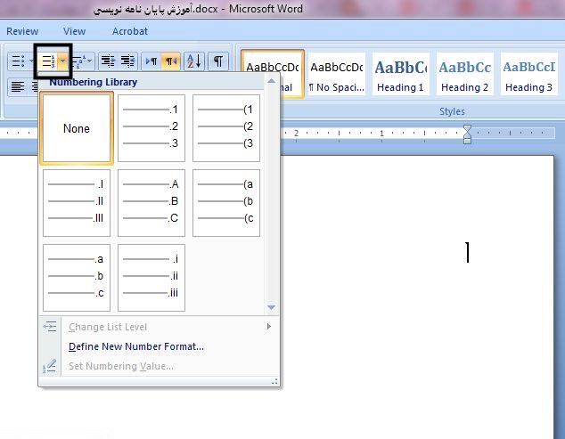 اگر هنگام نگارش پایان نامه، نیازمند شماره گذاری نکاتی از متن بودید، می توانید از منوی Home، گزینه Numbering را کلیک کرده و نوع شماره گذاری مورد نظرتان را انتخاب نمایید.