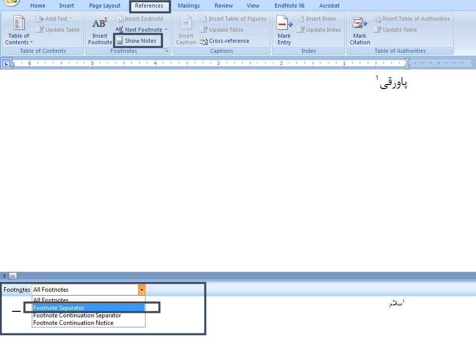 در قسمت پایین صفحه و از منوی باز شده، گزینه Footnote Separator را انتخاب کنید.