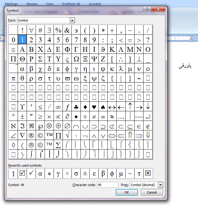 اگر بخواهید به جای اعداد، نمادی را بگذارید، باید در پنجره Footnote and Endnote، روی گزینه Symbol کلیک کنید. پنجره زیر باز می شود.